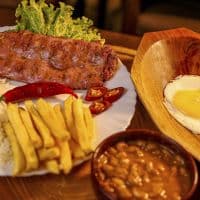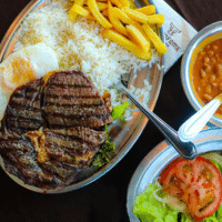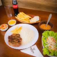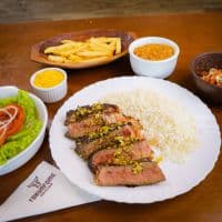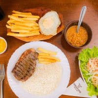 Acompanham arroz, feijão, batata frita, ovo, farofa, salada e vinagrete.