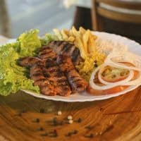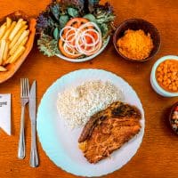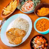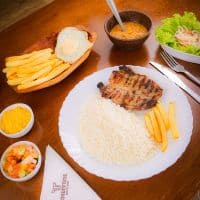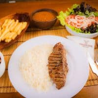 Acompanham arroz, feijão, batata frita, mandioca frita, farofa, salada e vinagrete.